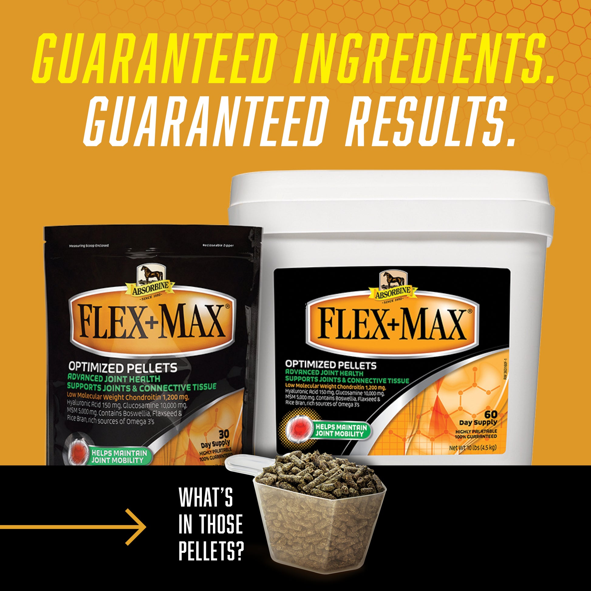 All-inclusive horse joint supplement. Flex+Max offers comprehensive joint care featuring enhanced ingredient levels for guaranteed results—all in a horse joint supplement offering a highly palatable formula with no fillers. Flex+Max also offers “guaranteed levels of glucosamine and chondroitin,” which is important when you consider that levels of active ingredients in supplements can vary widely, impacting the results they’re able to deliver.