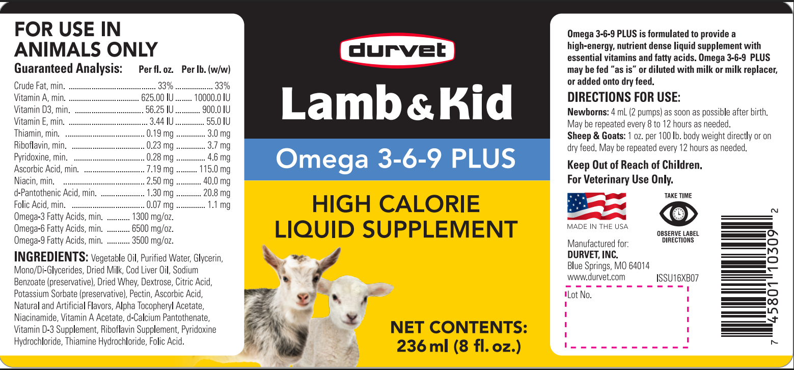 Lamb & Kid Omega 3-6-9 PLUS, formulated to be a high-energy, nutrient dense liquid supplement with essential vitamins, fatty acids and lecithin. May be fed “as is”, diluted with milk or milk replacer or top dressed on dry feed.