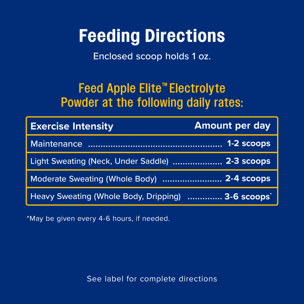 Electrolyte supplementation is often thought of as only needed by performance horses; however, any horse that sweats for a prolonged period of time, regardless of reason, will benefit from electrolyte supplementation. Apple Elite Electrolytes provides a complete electrolyte formula to replace vital minerals and encourage water consumption year-round.