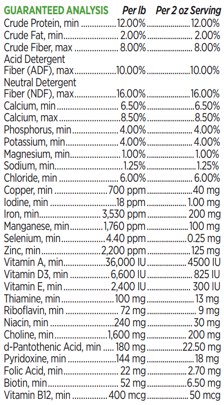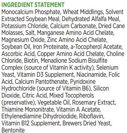 Monocalcium Phosphate, Wheat Middlings, Solvent Extracted Soybean Meal, Dehydrated Alfalfa Meal, Potassium Chloride, Calcium Carbonate, Dried Cane Molasses, Salt, Manganese Amino Acid Chelate, Magnesium Oxide, Zinc Amino Acid Chelate, Soybean Oil, Iron Proteinate, a-Tocopherol Acetate, Ascorbic Acid, Copper Amino Acid Chelate, Choline Chloride, Biotin, Menadione Sodium Bisulfite Complex (source of Vitamin K activity), Selenium Yeast, Vitamin D3 Supplement, Niacinamide, Folic Acid, Calcium Pantothenate, Pyridoxine Hydrochloride (source of Vitamin B6), Silicon Dioxide, Citric Acid, Mixed Tocopherols (preservative), Vegetable Oil, Rosemary Extract, Thiamine Mononitrate, Vitamin A Acetate, Ethylenediamine Dihydroiodide, Riboflavin, Vitamin B12 Supplement, Brewers Dried Yeast, Bentonite