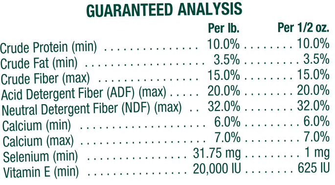 Feed 1/2 oz. (1 scoop) of Vita-Min E & Selenium supplement daily with regular grain ration.