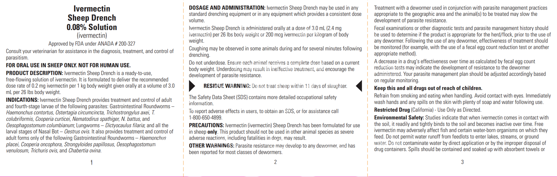 Ivermectin Sheep Drench is a ready-to-use, free-flowing solution of ivermectin. Ivermectin Sheep Drench provides treatment and control of adult and fourth-stage larvae of the following parasites: Gastrointestinal Roundworms – Haemonchus contortus, Ostertagia circumcincta, Trichostrongylus axei, T. colubriformis, Cooperia curticei, Nematodirus spathiger, N. battus, and Oesophagostomum columbianum; Lungworms – Dictyocaulus filaria; and all the larval stages of Nasal Bot – Oestrus ovis. It also provides treatment and control of adult forms only of the following Gastrointestinal Roundworms – Haemonchus placei, Cooperia oncophora, Strongyloides papillosus, Oesophagostomum venulosum, Trichuris ovis, and Chabertia ovina.