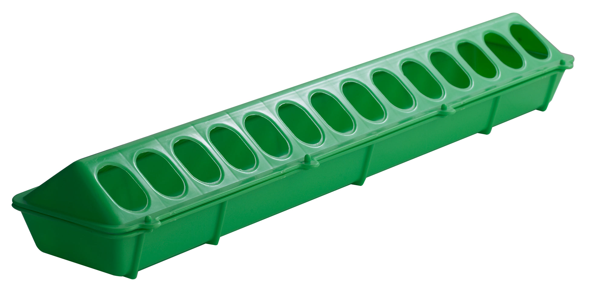 The flip top on this ground feeder makes it extra easy to fill and clean. Snap-in hinge ensures long life. Features 28 feeding holes (14 per side) for poultry. Made of high-density polypropylene.