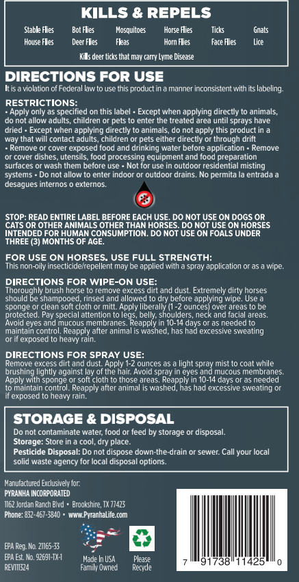 Thoroughly brush horse to remove excess dirt and dust. Extremely dirty horses should be shampooed, rinsed and allowed to dry before applying wipe. Use a sponge or clean soft cloth or mitt. Apply liberally (1 -2 ounces) over areas to be protected. Pay special attention to legs, belly, shoulders, neck and facial areas. Avoid eyes and mucous membranes. - DIRECTIONS FOR SPRAY USE: