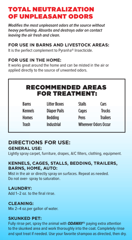 Banish bad odors with Pyranha Odaway: a concentrated, liquid odor absorber that eliminates a broad spectrum of household, garage, compost or kennel-borne odors. Odaway encapsulates and neutralizes odors instead of just masking them, leaving the premises smelling fresh and clean.